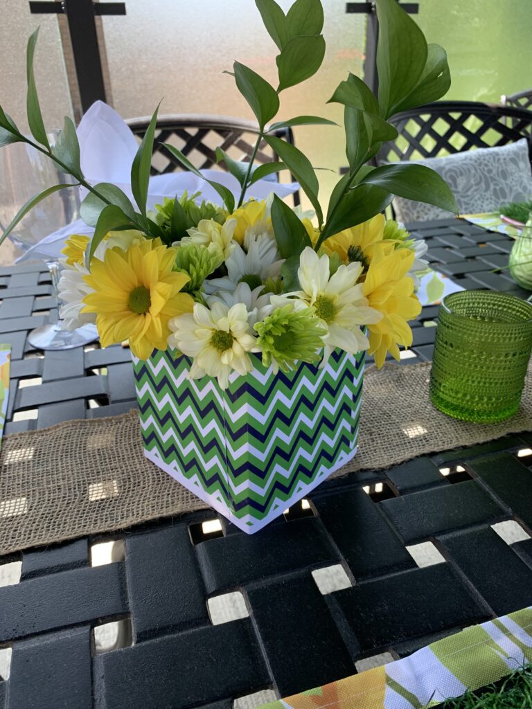 Down the centre of the table I used square vases from the dollar store and had my local florist make centre pieces in greens and yellow. I covered the square vases in the argyle paper to match the pots. I used an artificial grass pot that I had on hand and green votive candle holders.